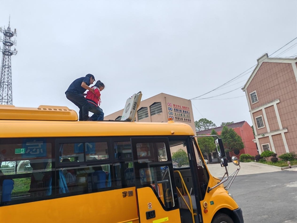 随后练习训练模仿校车落水变乱。校车因躲避不及坠入边水塘,驾驶员第一时间打开车顶应急逃生天窗,员组织学生解开平安带,驾驶员正在车顶策应学生,放置其蹲立正在车顶平安区域,并向边人员呼救。所有学生撤离至车顶后,员清点人数并拨打110、120求帮,同时指点学生连结沉着期待救援。