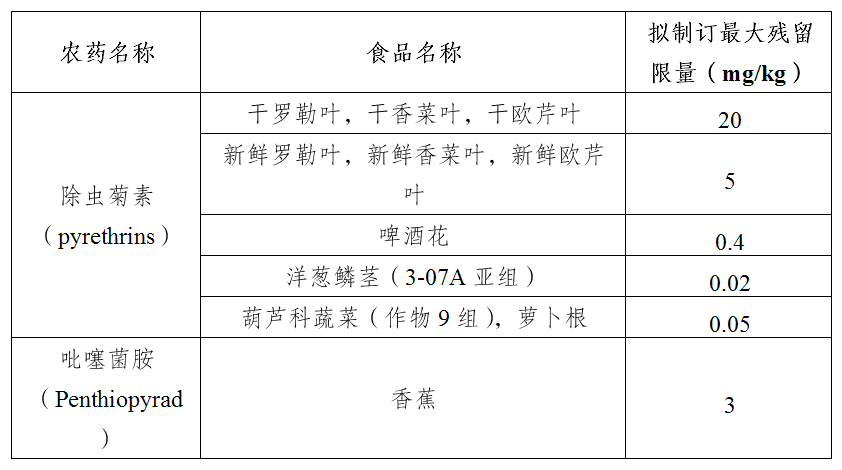 2025年11月12日,卫生部发布PMRL 2025-25、26号布告,拟制定部门食物中除虫菊素(pyrethrins)、吡噻菌胺(Penthiopyrad)等农药的最大残留限量,具体如下表。上述布告看法反馈期截至2026年1月26日。